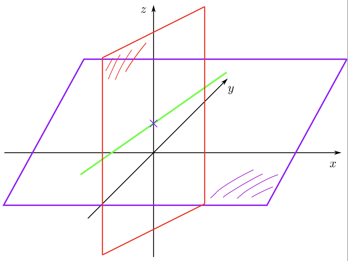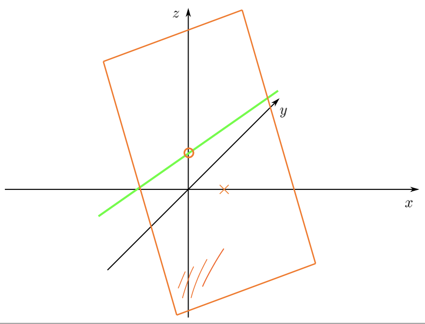 Nun nimmt man die Gerade an der sich die 2 Ebenen schneiden und zeichnet die 2. Ebene ein um den genauen Schnittpunkt zu erkennen
