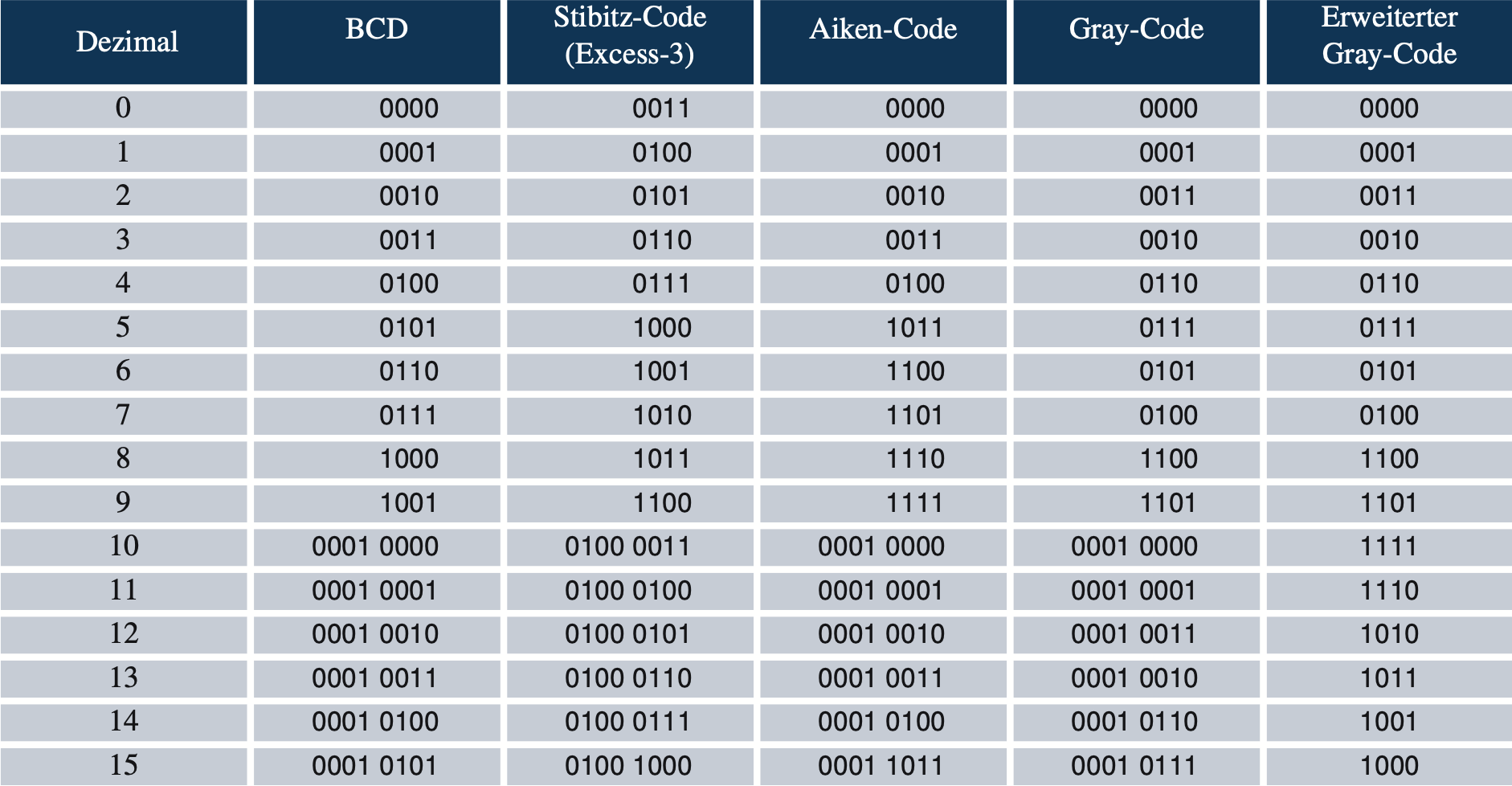 - Jede Ziffer ist 4 Bits breit (Tetrade). Es werden 6 Pseudo-Tetraden nicht verwendet da wir nur 0-9 benötigen